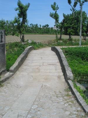 zweibogige antike Brücke führt über den Fluß Rio Selho.